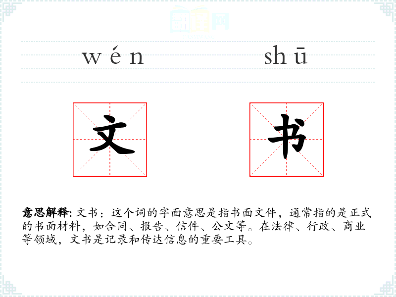 文书:这个词的字面意思是指书面文件,通常指的是正式的书面材料,如合同、报告、信件、公文等。在法律、行政、商业等领域,文书是记录和传达信息的重要工具。