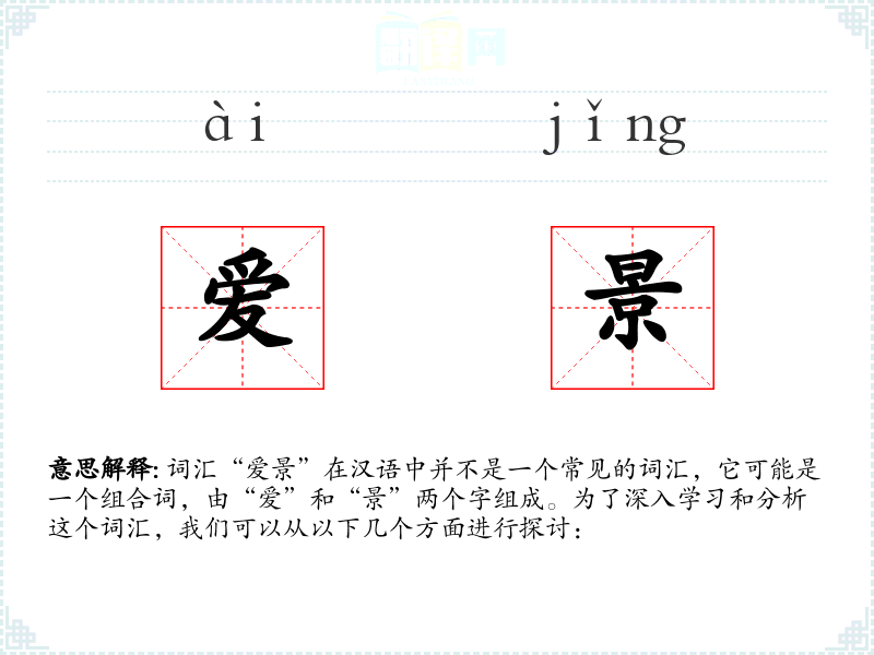词汇“爱景”在汉语中并不是一个常见的词汇,它可能是一个组合词,由“爱”和“景”两个字组成。为了深入学*和分析这个词汇,我们可以从以下几个方面进行探讨: