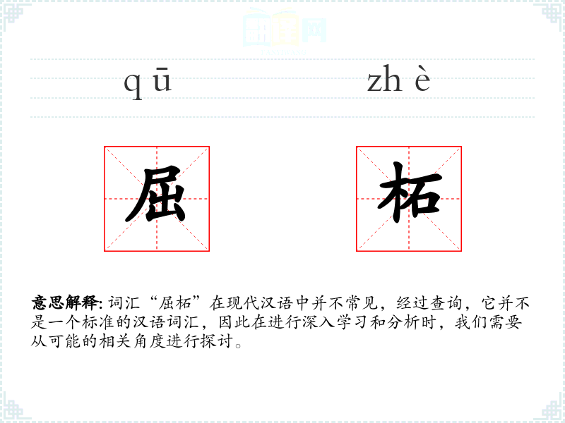 由于“屈柘”不是一个标准的汉语词汇,我们无法对其进行深入的分析和理解。在语言学习和表达中,了解和掌握标准词汇是非常重要的,这有助于我们更好地沟通和表达自己的思想。对于不常见的词汇,我们应该谨慎使用,并在必要时寻求更多的信息和解释。
