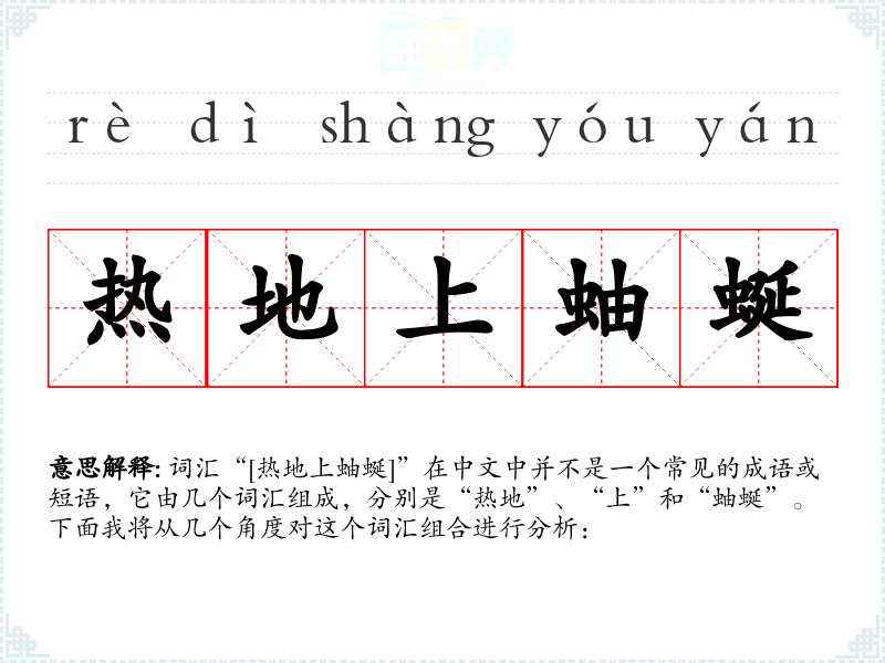 词汇“[热地上蚰蜒]”在中文中并不是一个常见的成语或短语,它由几个词汇组成,分别是“热地”、“上”和“蚰蜒”。下面我将从几个角度对这个词汇组合进行分析:
