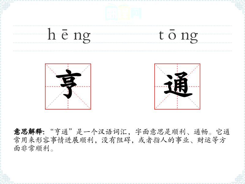 “亨通”是一个汉语词汇,字面意思是顺利、通畅。它通常用来形容事情进展顺利,没有阻碍,或者指人的事业、财运等方面非常顺利。