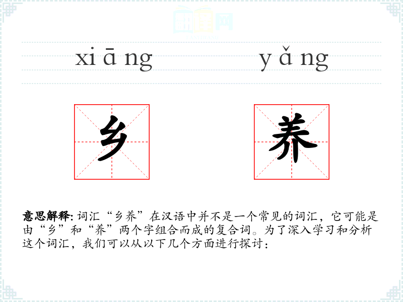 词汇“乡养”在汉语中并不是一个常见的词汇,它可能是由“乡”和“养”两个字组合而成的复合词。为了深入学*和分析这个词汇,我们可以从以下几个方面进行探讨: