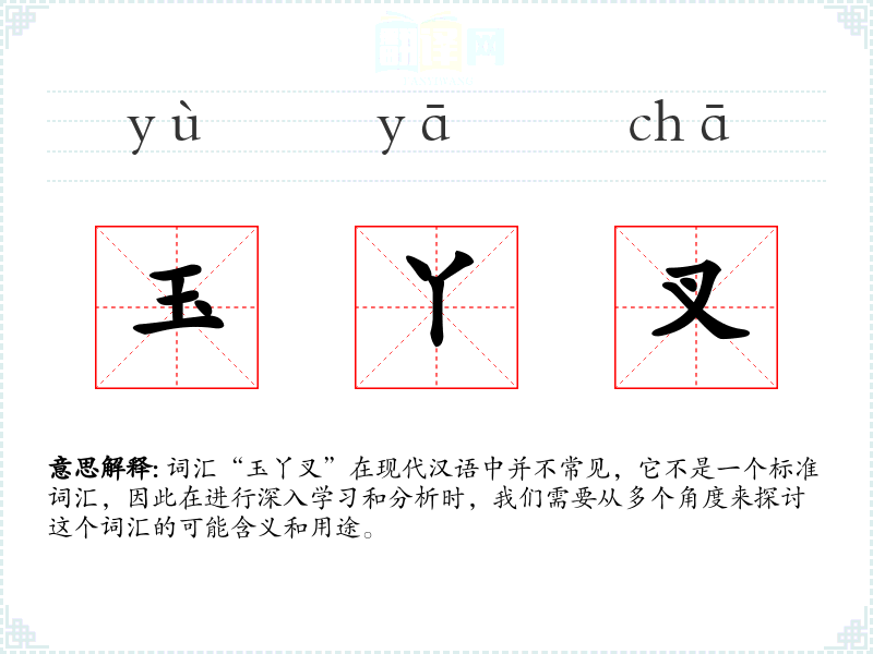 词汇“玉丫叉”在现代汉语中并不常见,它不是一个标准词汇,因此在进行深入学*和分析时,我们需要从多个角度来探讨这个词汇的可能含义和用途。