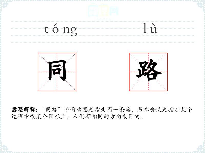“同路”字面意思是指走同一条路,基本含义是指在某个过程中或某个目标上,人们有相同的方向或目的。