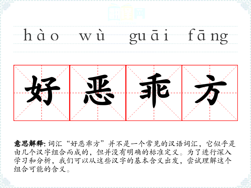 词汇“好恶乖方”并不是一个常见的汉语词汇,它似乎是由几个汉字组合而成的,但并没有明确的标准定义。为了进行深入学习和分析,我们可以从这些汉字的基本含义出发,尝试理解这个组合可能的含义。