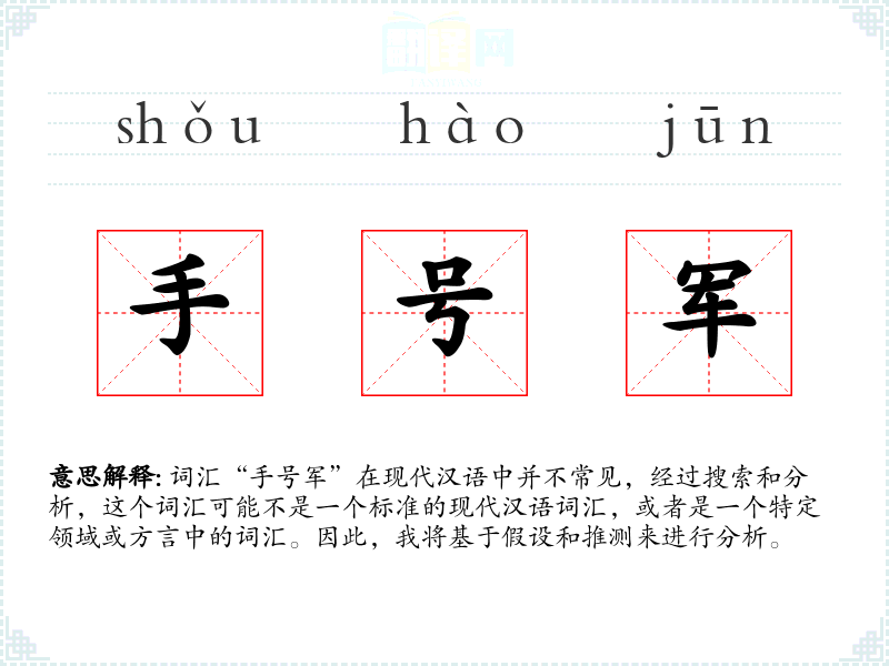 词汇“手号军”在现代汉语中并不常见,经过搜索和分析,这个词汇可能不是一个标准的现代汉语词汇,或者是一个特定领域或方言中的词汇。因此,我将基于假设和推测来进行分析。