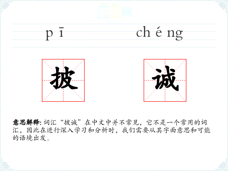 由于“披诚”不是一个常用词汇,它在文学、口语或专业领域中的使用非常有限。可能在一些特定的文学作品或古文中出现,用以形容某人表现出真诚的态度。