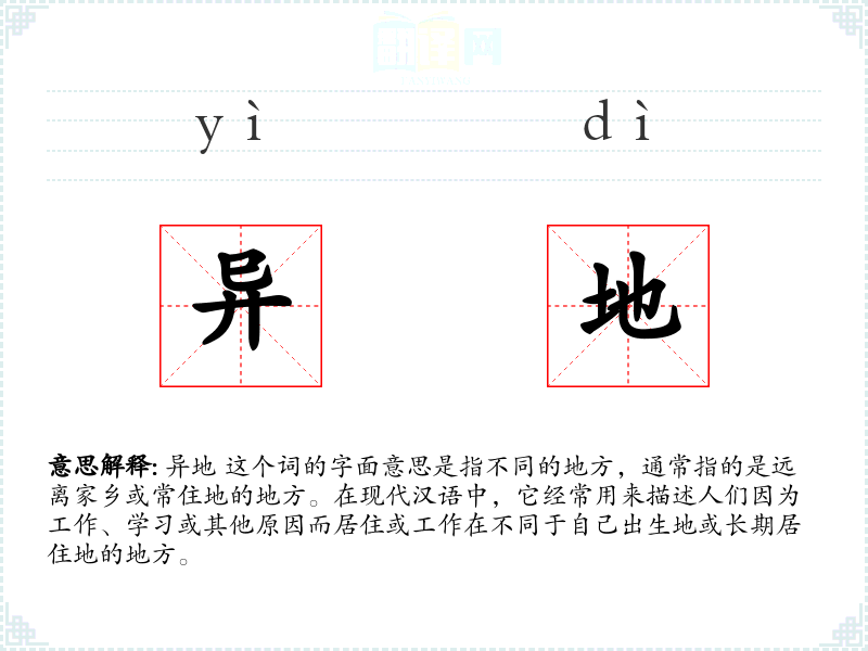 "异地"的意思解释、异地是什么意思由翻译网汉语词典查词提供。