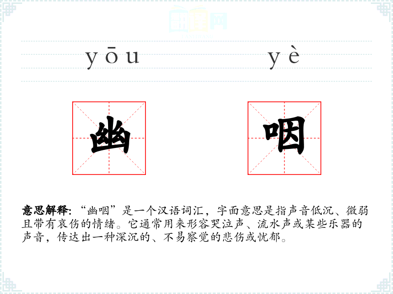 “幽咽”是一个汉语词汇,字面意思是指声音低沉、微弱且带有哀伤的情绪。它通常用来形容哭泣声、流水声或某些乐器的声音,传达出一种深沉的、不易察觉的悲伤或忧郁。