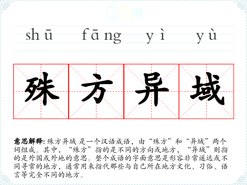 殊方异域 是一个汉语成语,由“殊方”和“异域”两个词组成。其中,“殊方”指的是不同的方向或地方,“异域”则指的是外国或外地的意思。整个成语的字面意思是形容非常遥远或不同寻常的地方,通常用来指代那些与自己所在地方文化、*俗、语言等完全不同的地方。