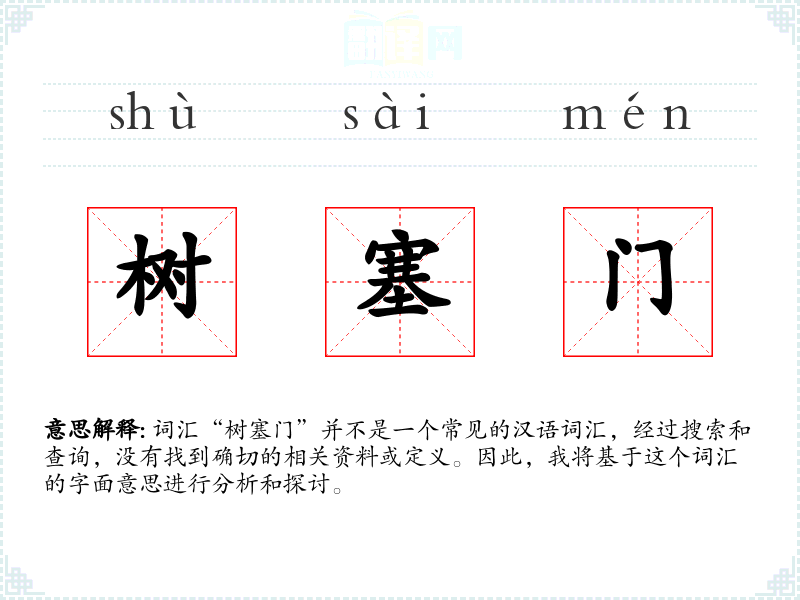 “树塞门”字面意思可能是指用树枝或其他物体堵塞门的行为或状态。这里的“树”可能指的是树木或树枝,“塞”表示堵塞或阻塞,“门”则是指出入口或通道。