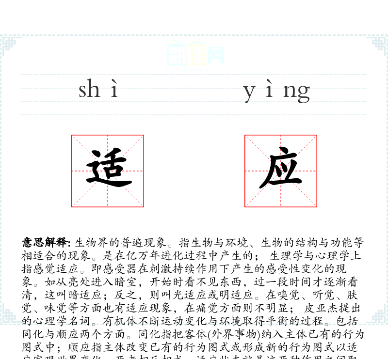 生物界的普遍现象。指生物与环境、生物的结构与功能等相适合的现象。是在亿万年进化过程中产生的; 生理学与心理学上指感觉适应。即感受器在刺激持续作用下产生的感受性变化的现象。如从亮处进入暗室,开始时看不见东西,过一段时间才逐渐看清,这叫暗适应;反之,则叫光适应或明适应。在嗅觉、听觉、肤觉、味觉等方面也有适应现象,在痛觉方面则不明显; 皮亚杰提出的心理学名词。有机体不断运动变化与环境取得平衡的过程。包括同化与顺应两个方面。同化指把客体(外界事物)纳入主体已有的行为图式中;顺应指主体改变已有的行为图式或形成新的行为图式以适应客观世界变化。两者相反相成,适应状态就是这两种作用之间取得相对平衡的结果。儿童的智力发展依赖于同化和顺应从最初不稳定的平衡过渡到逐渐稳定的平衡。