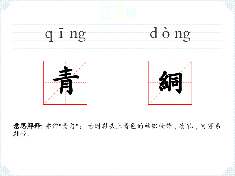 亦作"青句"; 古时鞋头上青色的丝织妆饰﹐有孔﹐可穿系鞋带。