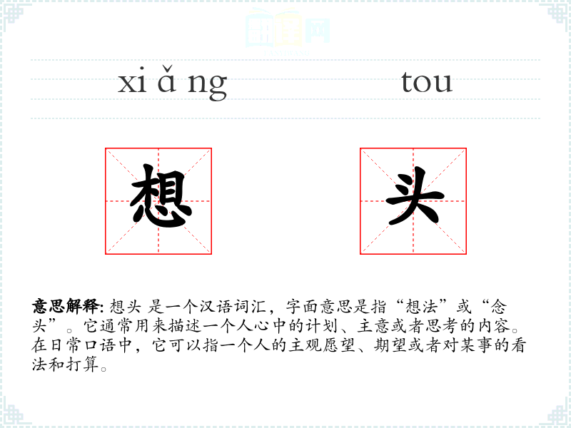 - 口语:在日常对话中,“想头”可以用来询问或表达某人的打算,如“你最近有什么新的想头吗?”