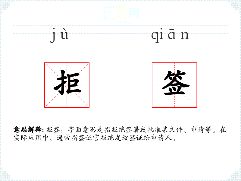 “拒签”一词由“拒”和“签”两个字组成。“拒”意为拒绝,“签”指签署或批准。这个词在现代汉语中主要用于签证领域,但随着全球化,其使用频率逐渐增加。