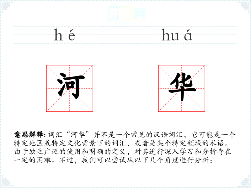 由于“河华”不是一个标准词汇,我们无法对其进行深入的理解和总结。如果“河华”是一个特定地区或特定文化背景下的词汇,那么了解其具体含义和使用语境将有助于更好地理解和分析该词汇。