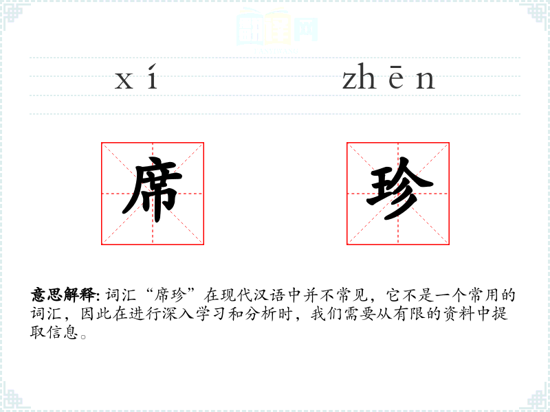 词汇“席珍”在现代汉语中并不常见,它不是一个常用的词汇,因此在进行深入学*和分析时,我们需要从有限的资料中提取信息。