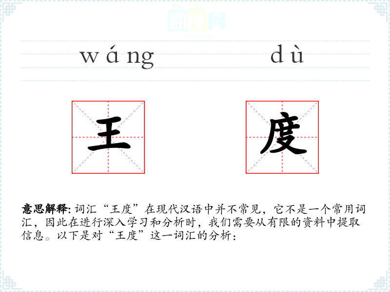 词汇“王度”在现代汉语中并不常见,它不是一个常用词汇,因此在进行深入学*和分析时,我们需要从有限的资料中提取信息。以下是对“王度”这一词汇的分析: