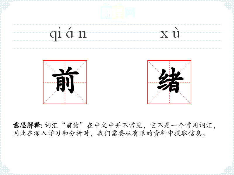 “前绪”字面意思是指事情开始前的准备或开端。它由“前”和“绪”两个字组成,“前”表示在前面或之前,“绪”通常指线索或开端。