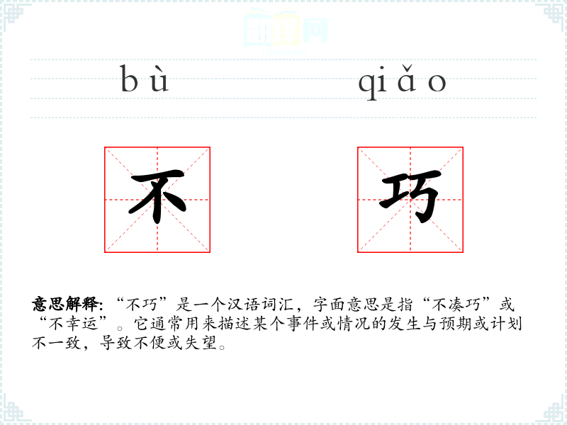 “不巧”由“不”和“巧”两个字组成。“不”表示否定,“巧”原指技艺高超,后引申为机会好、幸运。两者结合,形成了表示不幸或不凑巧的含义。