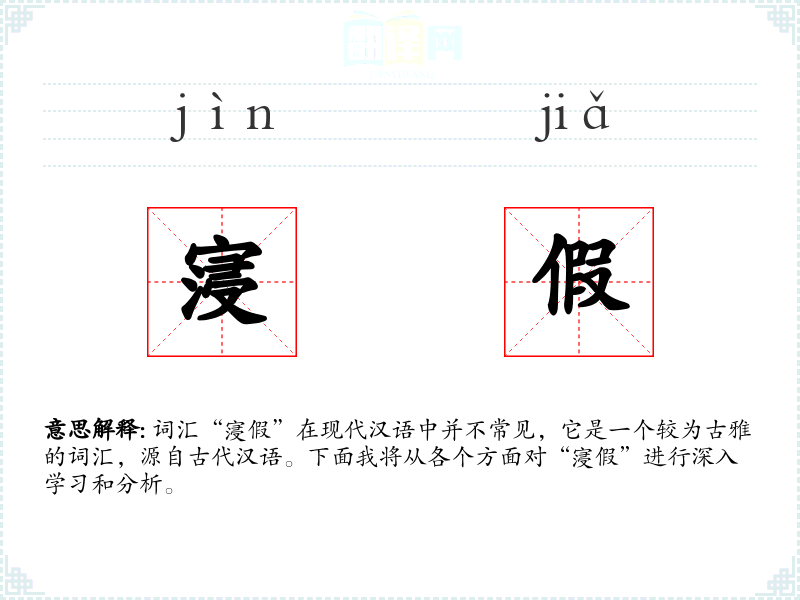 词汇“寖假”在现代汉语中并不常见,它是一个较为古雅的词汇,源自古代汉语。下面我将从各个方面对“寖假”进行深入学*和分析。