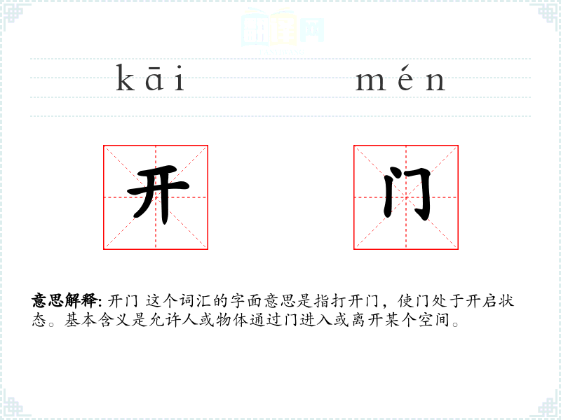 开门 这个词汇的字面意思是指打开门,使门处于开启状态。基本含义是允许人或物体通过门进入或离开某个空间。