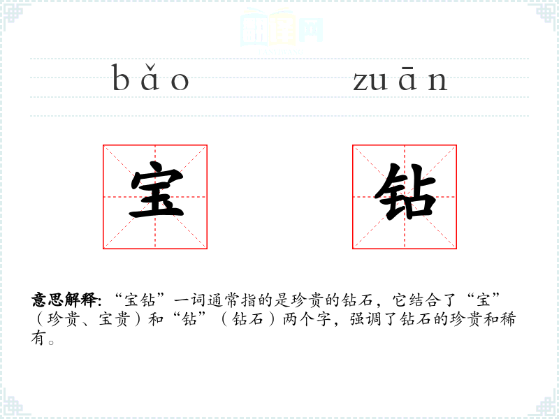 “宝钻”一词通常指的是珍贵的钻石,它结合了“宝”(珍贵、宝贵)和“钻”(钻石)两个字,强调了钻石的珍贵和稀有。