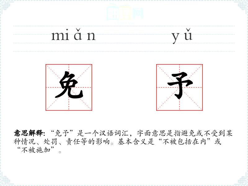 “免予”是一个汉语词汇,字面意思是指避免或不受到某种情况、处罚、责任等的影响。基本含义是“不被包括在内”或“不被施加”。