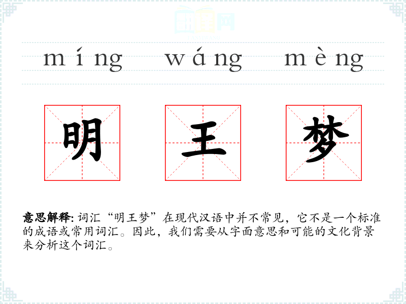 词汇“明王梦”在现代汉语中并不常见,它不是一个标准的成语或常用词汇。因此,我们需要从字面意思和可能的文化背景来分析这个词汇。