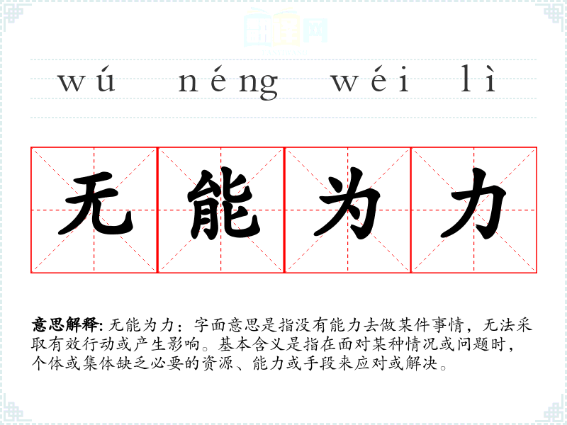 无能为力:字面意思是指没有能力去做某件事情,无法采取有效行动或产生影响。基本含义是指在面对某种情况或问题时,个体或集体缺乏必要的资源、能力或手段来应对或解决。