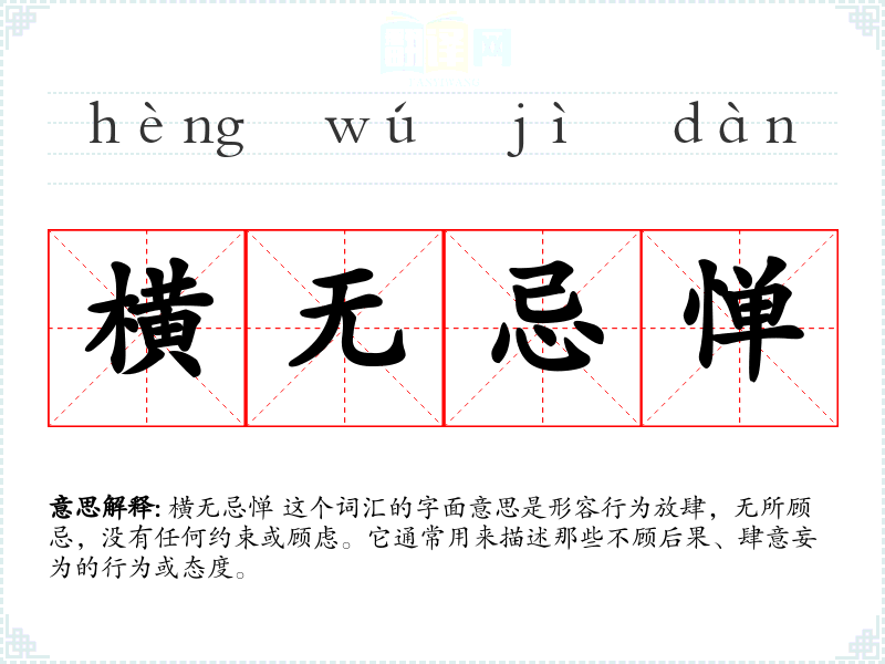 横无忌惮 这个词汇的字面意思是形容行为放肆,无所顾忌,没有任何约束或顾虑。它通常用来描述那些不顾后果、肆意妄为的行为或态度。