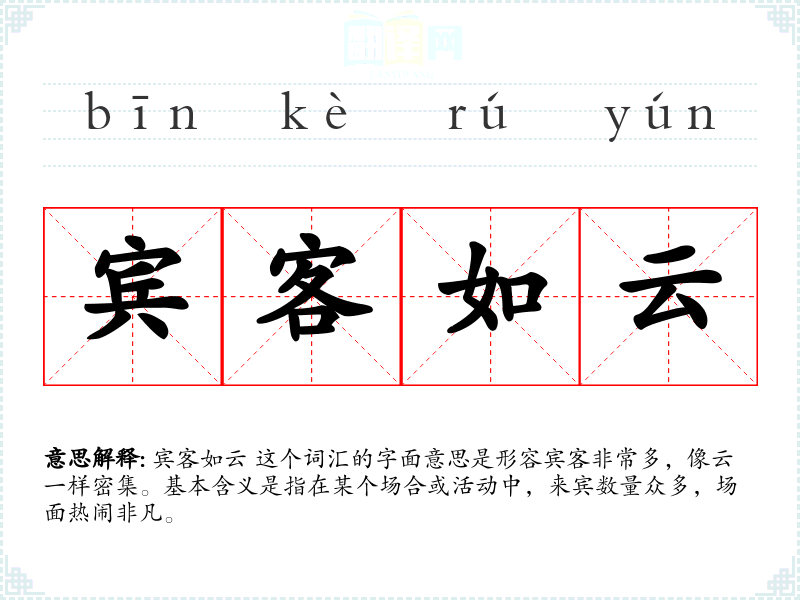 词源:这个词汇的词源较为直观,由“宾客”和“如云”两个部分组成,形象地描绘了宾客众多的场景。