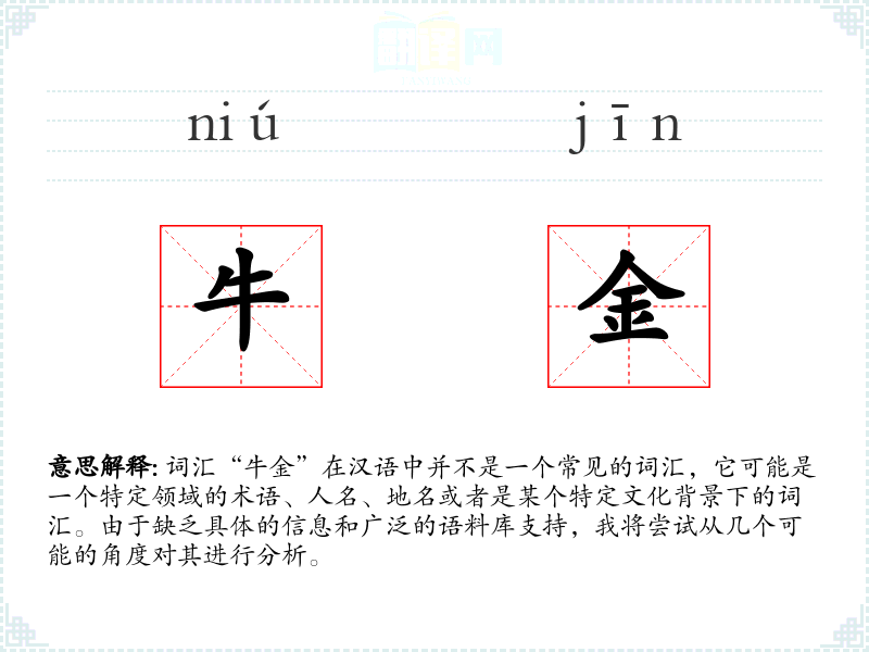 由于“牛金”不是一个标准词汇,我们无法给出一个确切的基本定义。它可能是由“牛”和“金”两个字组合而成的复合词,其中“牛”通常指动物牛,也有强壮、厉害的含义;“金”则通常指金属金,也有珍贵、财富的含义。