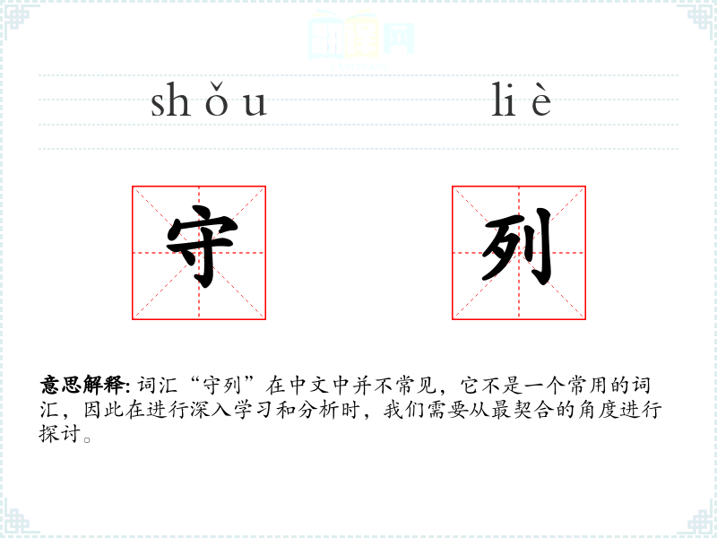 “守列”由“守”和“列”两个字组成。“守”意为守护、保持,“列”意为行列、队列。这个词可能源自古代军事用语,后来扩展到其他需要保持秩序的场合。