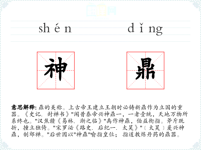 1.鼎的美称。上古帝王建立王朝时必铸新鼎作为立国的重器。《史记.封禅书》"闻昔泰帝兴神鼎一,一者壹统,天地万物所系终也。"汉焦赣《易林.渐之临》"禹作神鼎,伯益衔指。斧斤既折,撞立独倚。"宋罗泌《路史.后纪一.太昊》"﹝太昊﹞爰兴神鼎,制郊禅。"后世因以"神鼎"喻指皇位; 指道教炼丹药的鼎器。