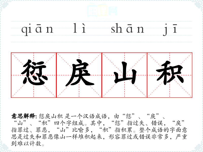 愆戾山积 是一个汉语成语,由“愆”、“戾”、“山”、“积”四个字组成。其中,“愆”指过失、错误,“戾”指罪过、罪恶,“山”比喻多,“积”指积累。整个成语的字面意思是过失和罪恶像山一样堆积起来,形容罪过或错误非常多,严重到难以计数。