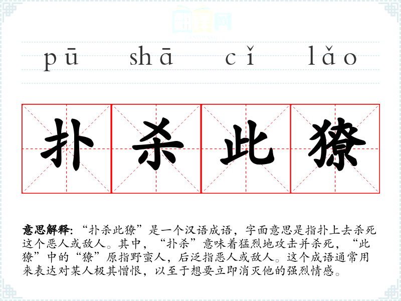 “扑杀此獠”是一个汉语成语,字面意思是指扑上去杀死这个恶人或敌人。其中,“扑杀”意味着猛烈地攻击并杀死,“此獠”中的“獠”原指野蛮人,后泛指恶人或敌人。这个成语通常用来表达对某人极其憎恨,以至于想要立即消灭他的强烈情感。