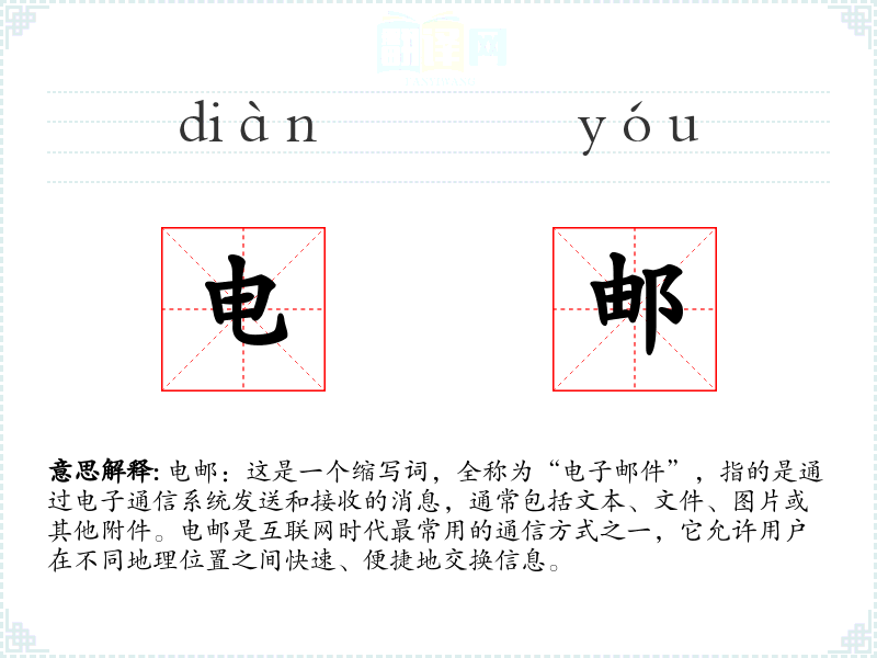 - 反义词:无,因为电邮是一种现代通信方式,没有直接的反义词。