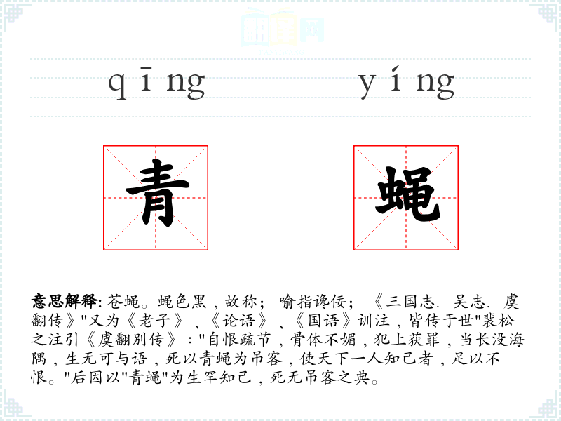 1.苍蝇。蝇色黑﹐故称; 喻指谗佞; 《三国志.吴志.虞翻传》"又为《老子》﹑《论语》﹑《国语》训注﹐皆传于世"裴松之注引《虞翻别传》﹕"自恨疏节﹐骨体不媚﹐犯上获罪﹐当长没海隅﹐生无可与语﹐死以青蝇为吊客﹐使天下一人知己者﹐足以不恨。"后因以"青蝇"为生罕知己﹐死无吊客之典。