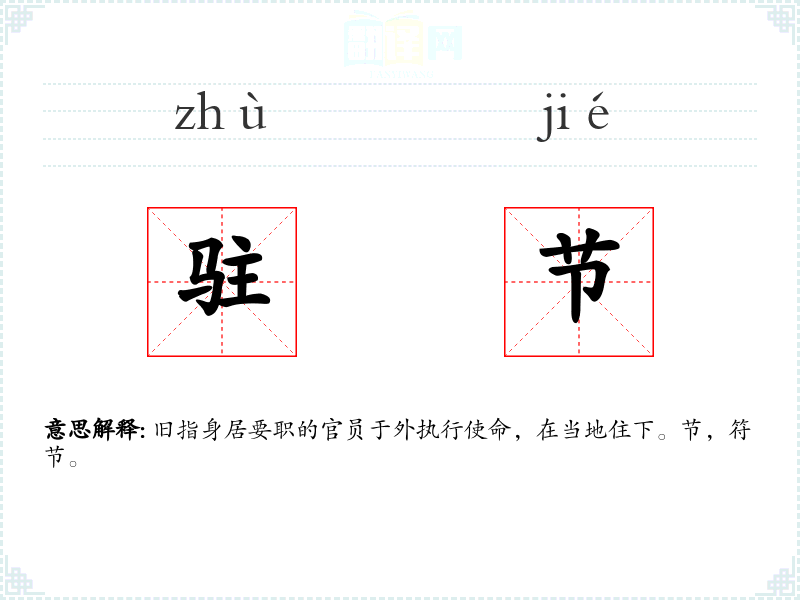 旧指身居要职的官员于外执行使命,在当地住下。节,符节。