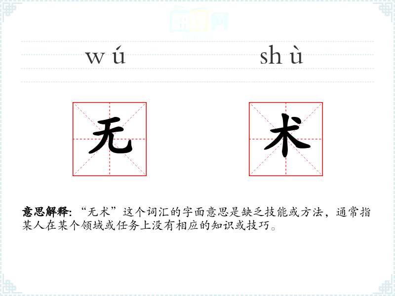 “无术”这个词汇的字面意思是缺乏技能或方法,通常指某人在某个领域或任务上没有相应的知识或技巧。