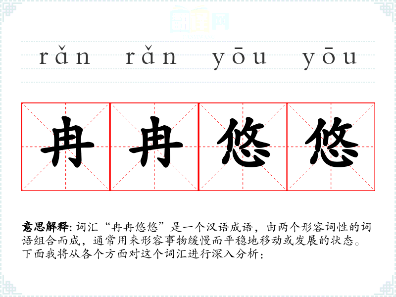 词汇“冉冉悠悠”是一个汉语成语,由两个形容词性的词语组合而成,通常用来形容事物缓慢而平稳地移动或发展的状态。下面我将从各个方面对这个词汇进行深入分析: