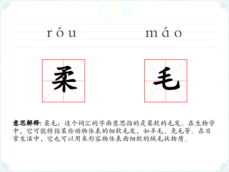- 专业领域:在纺织学或动物学中,“柔毛”可能特指某种纤维或动物毛发的特性。