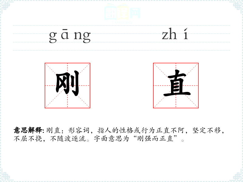 刚直:形容词,指人的性格或行为正直不阿,坚定不移,不屈不挠,不随波逐流。字面意思为“刚强而正直”。
