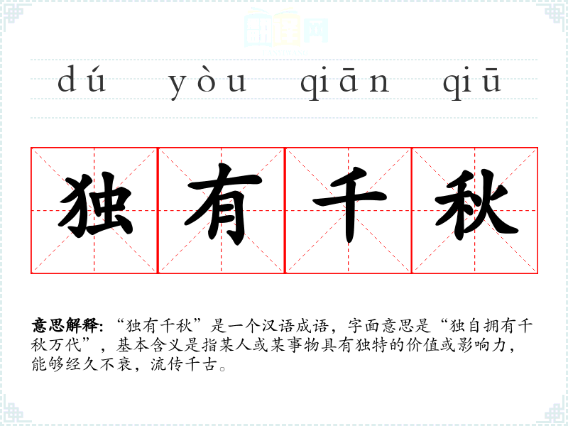 “独有千秋”是一个汉语成语,字面意思是“独自拥有千秋万代”,基本含义是指某人或某事物具有独特的价值或影响力,能够经久不衰,流传千古。