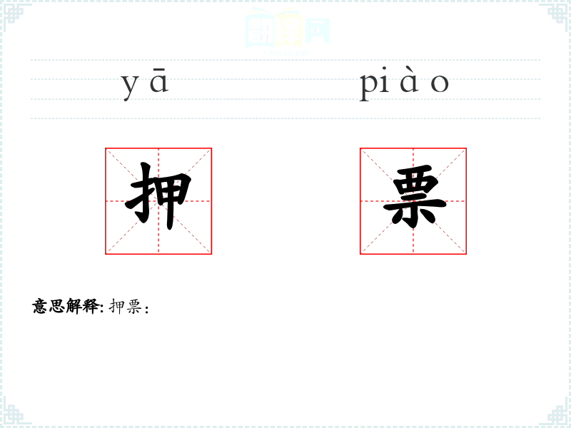 - 词源:押票一词源自法律术语,最初可能来源于“押”(保证)和“票”(文件)的结合。