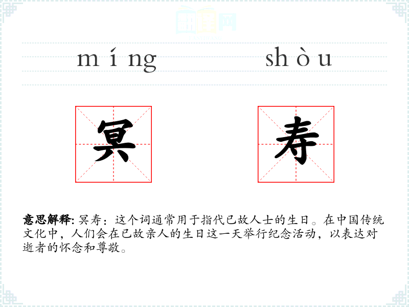 冥寿:这个词通常用于指代已故人士的生日。在**传统文化中,人们会在已故亲人的生日这一天举行纪念活动,以表达对逝者的怀念和尊敬。