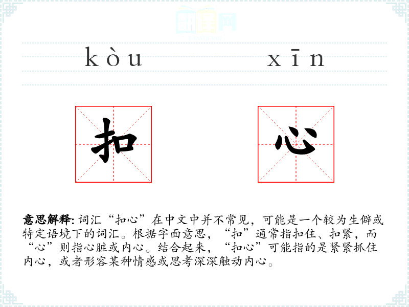 词汇“扣心”在中文中并不常见,可能是一个较为生僻或特定语境下的词汇。根据字面意思,“扣”通常指扣住、扣紧,而“心”则指心脏或内心。结合起来,“扣心”可能指的是紧紧抓住内心,或者形容某种情感或思考深深触动内心。