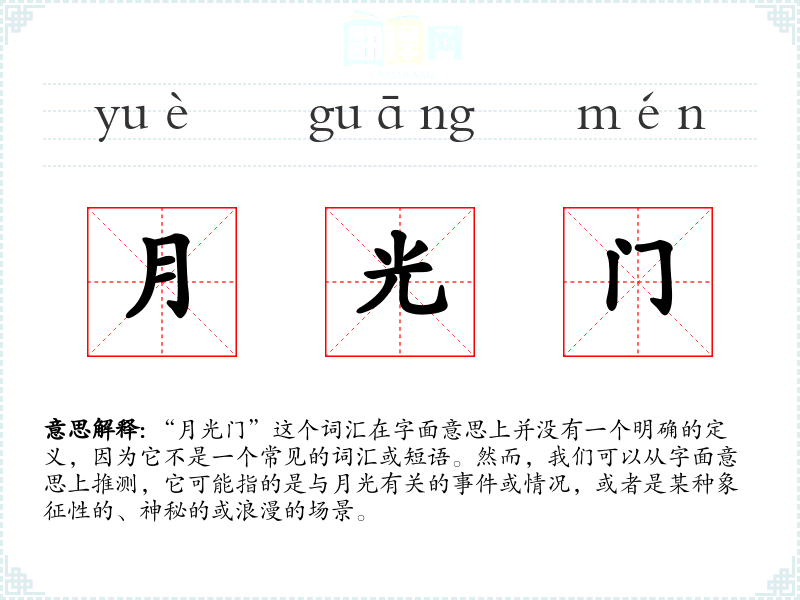 “月光门”这个词汇在字面意思上并没有一个明确的定义,因为它不是一个常见的词汇或短语。然而,我们可以从字面意思上推测,它可能指的是与月光有关的**或情况,或者是某种象征性的、神秘的或浪漫的场景。