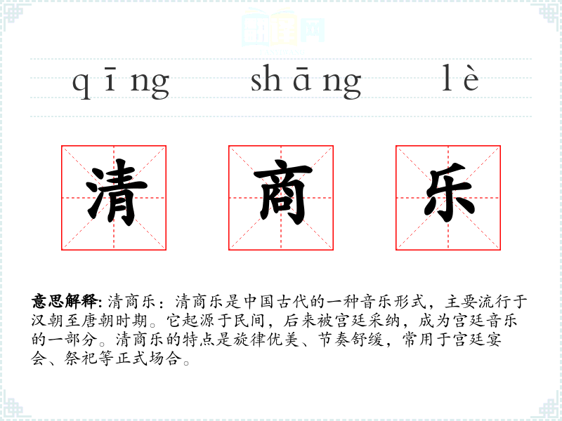 清商乐作为一个历史悠久的音乐形式,不仅代表了古代音乐的艺术成就,也反映了当时的社会文化和礼仪制度。在语言学*和表达中,了解和运用这样的词汇可以丰富我们的文化知识和语言表达的深度。